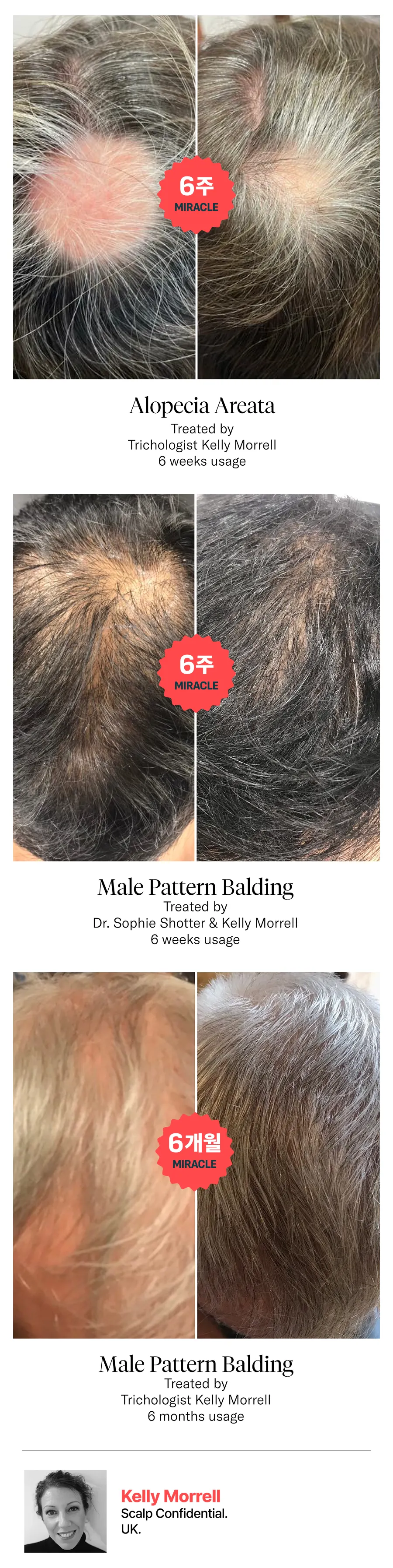 은 특히 휴지기(TE), 산후, 견인성 탈모에 도움이 되며, 현미경 관찰 결과 두피 염증이 감소하여 모발이 건강하게 자랄 수 있는 환경이 조성되었습니다.